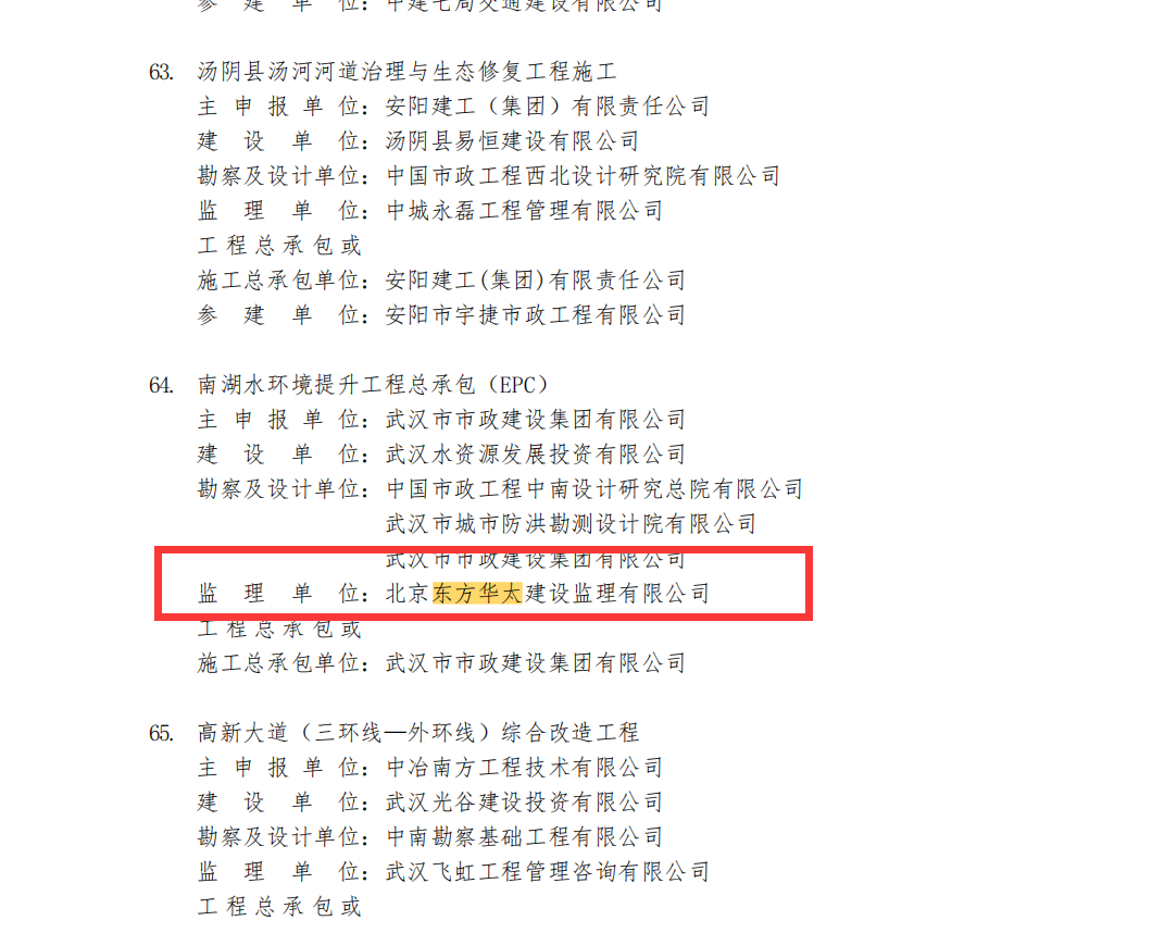 近日,中國市政工程協會公布“2024年度通過市政工程最高質量水平評價工程名單”,其中東方華太公司承監的南湖水環境提升工程總承包(EPC)、武昌生態文化長廊工程(友誼大道-建設十路)PPP 項目榮獲“2024年度市政工程最高質量水平評價”。