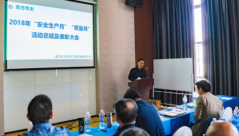 東方華太“安全生產月”、“質量月”及監協知識競賽頒獎大會,于2018113日在蘇美道森酒店18樓會議室召開,會議由監理管理部主持,公司領導、各監理業務部負責人、現場項目負責人、青年骨干代表共計80余人參加了本次會議。